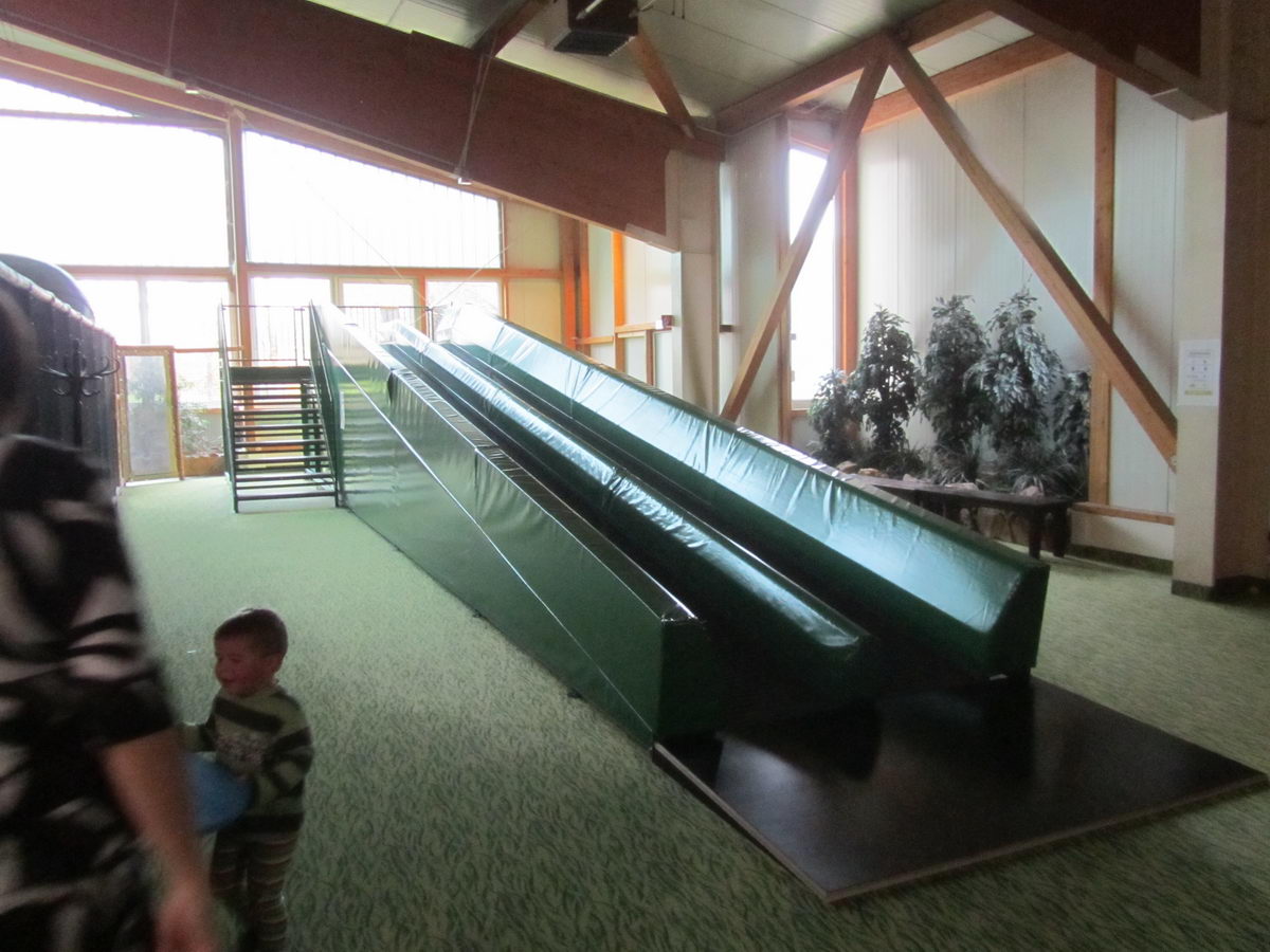 Går man til den anden side af det store klatre land er der en ruchebane som man tager måtter med op i for herefter at køre ned af nogle sjove ruller alá transportbåndsruller og får man sat sin måtte helt lige går det faktisk rigtig hurtig og når turen er færdig stopper man lige så hurtig så her er nød til at holde godt fast i de små purke og prinsesser man som forældre har medbragt som undskyldning for en tur i denne sjove aktivitet.